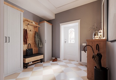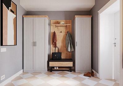 - Мебель выполнена в цвете «блан шене», верхние крышки шкафов и стола — в цвете «дуб бунратти»;